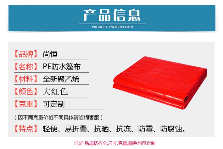 大紅色PE防水篷布加厚包角:四周包角加固處理,既方便固定又不懼拉力保護雨布,使用壽命長。