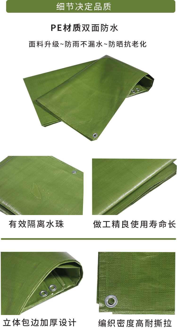 淡黃綠色PE防水篷布PE材質(zhì)雙面防水,面料升級,防雨不漏水,防曬抗老化,有效隔離水珠,做工精良使用壽命長,立體包邊加厚設(shè)計,編織密度高耐撕拉。