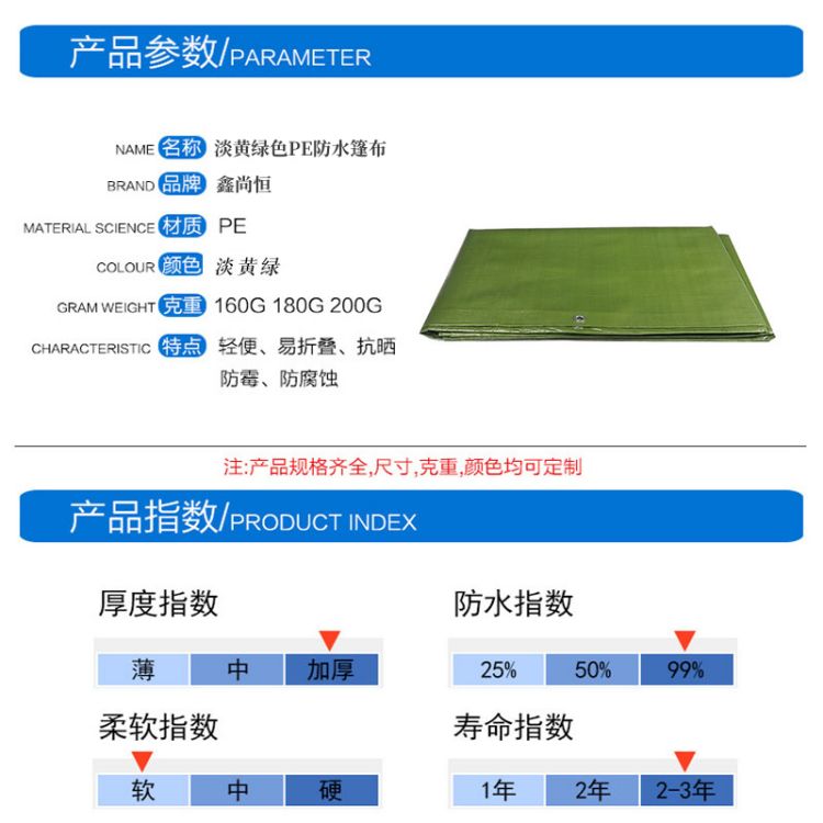產(chǎn)品介紹淡黃綠色PE防水篷布產(chǎn)品參數(shù)淡黃綠色PE防水篷布PE材質(zhì)雙面防水,面料升級,防雨不漏水,防曬抗老化,有效隔離水珠,做工精良使用···