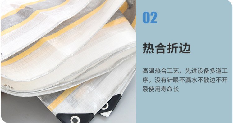 金包銀色PE防水篷布熱合折邊,高溫?zé)岷瞎に?,先進(jìn)設(shè)備多道工序,沒有針眼不漏水不散邊不開裂使用壽命長。