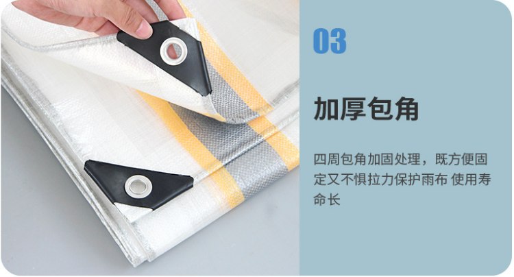 金包銀色PE防水篷布加厚包角:四周包角加固處理,既方便固定又不懼拉力保護(hù)雨布,使用壽命長。