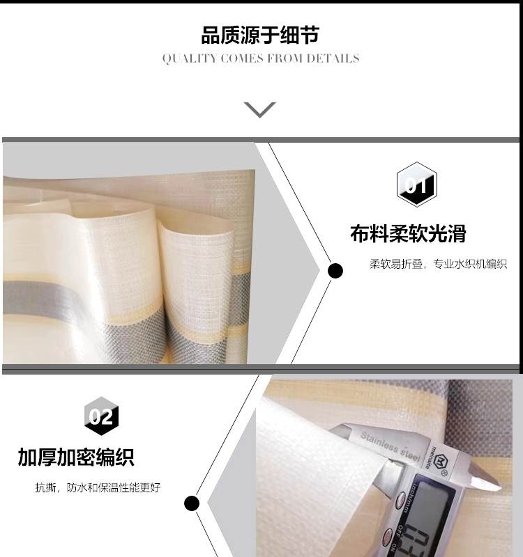 金包銀色PE防水篷布品質(zhì)源于細(xì)節(jié):布料柔軟光滑,柔軟易折疊,專業(yè)水織機(jī)編織;加厚加密編織,抗撕,防水和保溫性能更好。