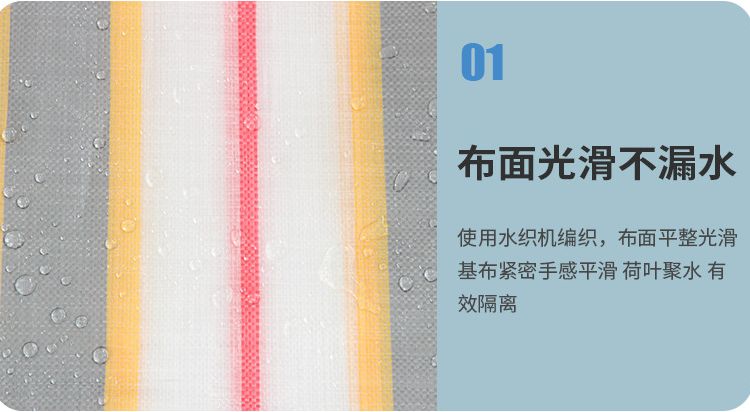 金包銀色PE防水篷布布面光滑不漏水,使用水織機(jī)編織,布面平整光滑,基布緊密手感平滑,荷葉聚水,有效隔離。