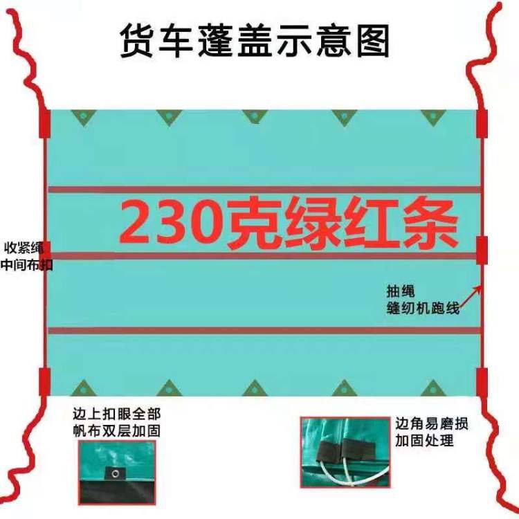 產(chǎn)品介紹綠紅條色PE防水篷布汽車篷布,貨車篷蓋示意圖如上。綠紅條色PE防水篷布高溫?zé)崛燮唇?,無(wú)縫拼接不漏水;雙面PE覆膜,雙面防水;金···