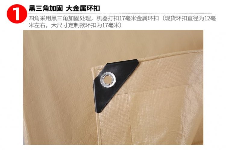 產(chǎn)品介紹肉色PE防水篷布加厚包角,四角采用黑三角加固處理,大金屬環(huán)扣,機器打扣17mm金屬環(huán)扣。肉色PE防水篷布四邊打孔,默認常規(guī)1米一個···